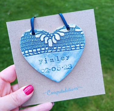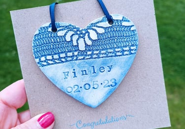 These decorations can be made in any colour or design you'd like for example a birth keepsake with baby's name and date of birth or a wedding keepsake. These can be simply hanging, mounted on a card or framed. Please get in touch to order or for more details.