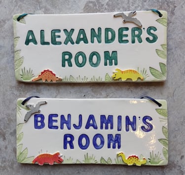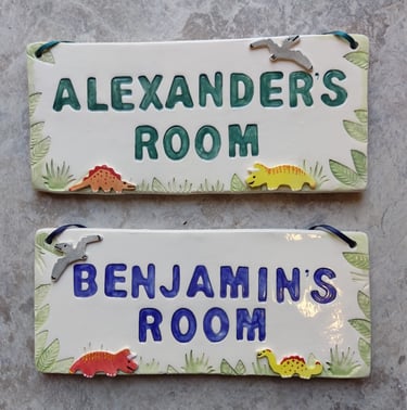 I can male a ceramic signs for anything including kids room signs, business logos (like mine!) or a sign for your house, with or without imprints. Each sign is made to your specifications so is completely unique. Please get in touch to find out more.
